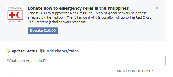 Όσοι χρήστες κάνουν log in στον λογαριασμό τους στο Facebook σήμερα βλέπουν στο πάνω μέρος του timeline τους μήνυμα από το Facebook που τους καλεί να προχωρήσουν σε donation για την ανακούφιση των πληγέντων από τον τυφώνα στις Φιλιππίνες.